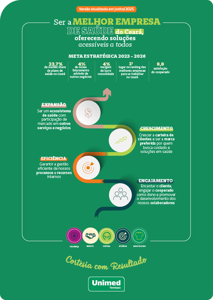 A Unimed Fortaleza baseia sua gestão na definição clara de objetivos e iniciativas. Essa abordagem é crucial para o alcance das metas e para o fortalecimento da identidade organizacional.