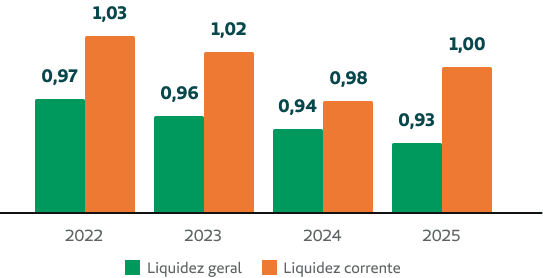 A cooperativa apresenta índice de liquidez corrente de 1,00 e índice de liquidez geral de 0,93.