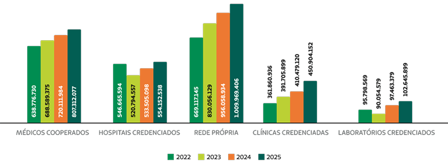 A receita total líquida da cooperativa foi de R$ 3,4 bilhões em 2025 e aumentou 9,26% em relação a 2024. A receita total líquida é composta principalmente pelas receitas de planos, vendas de serviços particulares, aluguel de rede, taxa de administração do intercâmbio, receitas financeiras e patrimoniais.
