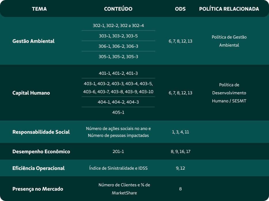 Lista dos temas materiais e conexão com os conteúdos e ODS: