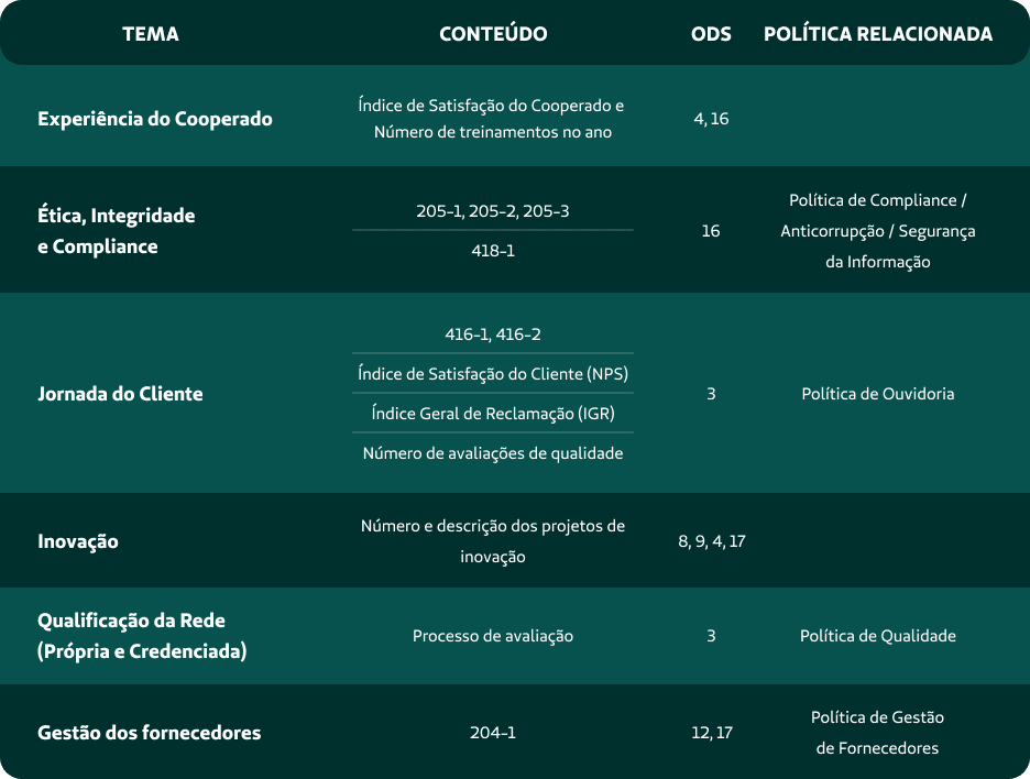 Os temas materiais identificados foram submetidos a uma validação por meio de consulta a especialistas do setor e à alta Direção da Unimed Fortaleza. O objetivo foi assegurar a robustez, a coerência e a consistência metodológica do processo de materialidade.